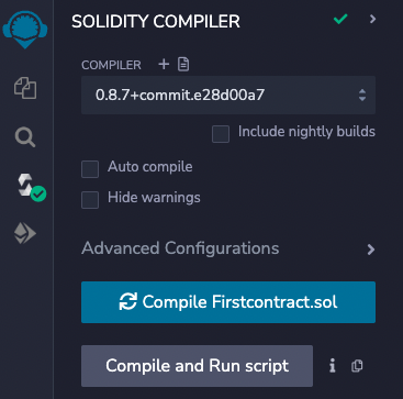 The contract should auto-compile, but click [Compile Firstcontract.sol] to ensure compilation.