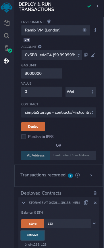 Click Deploy to deploy the contract. Test by entering any number in the store function (set) and then calling retrieve to get that number (get).